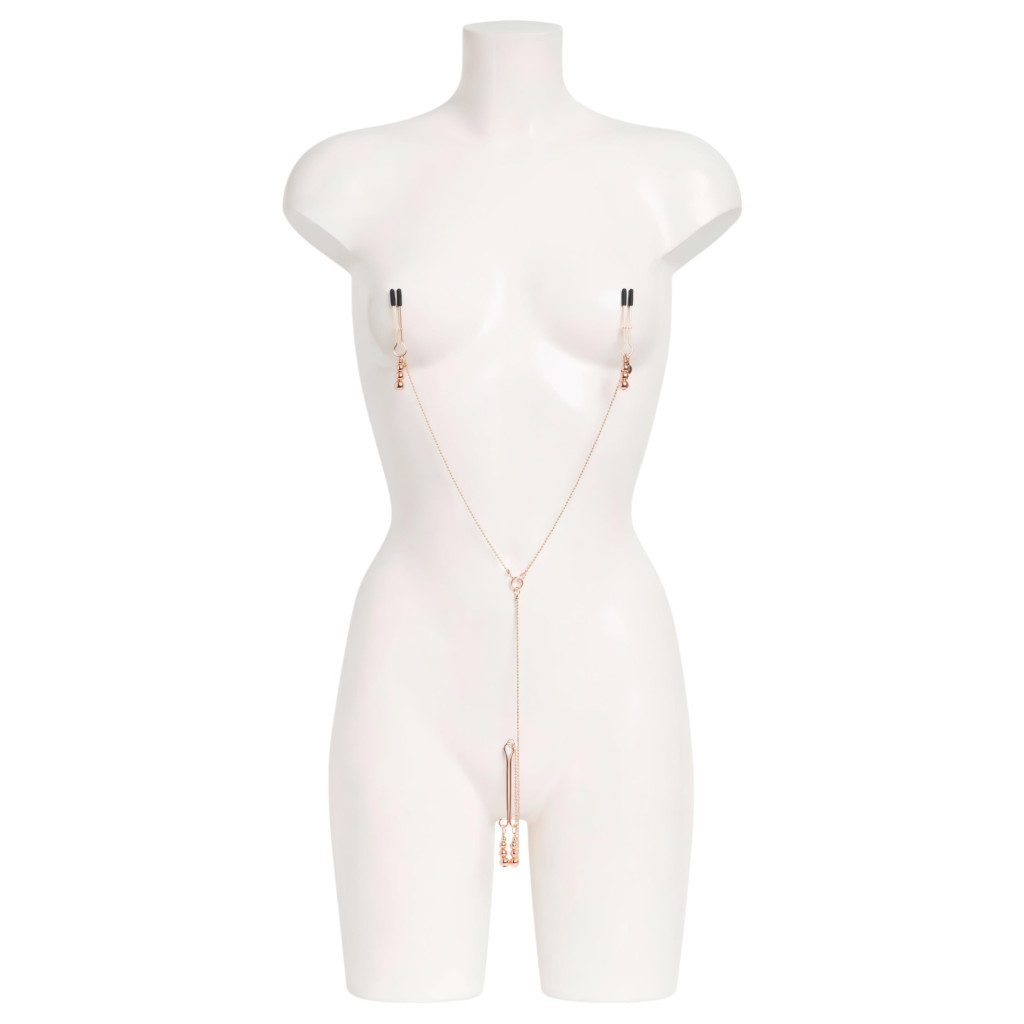 A kis szeméremajkakra csíptethető klitorisz ékszer és egy pár mellbimbócsipesz, nikkelmentes fémből, eltérő méretű gyöngyökből álló függő díszekkel és fém márkajelzéssel, Y-alakú fém lánccal összekötve.