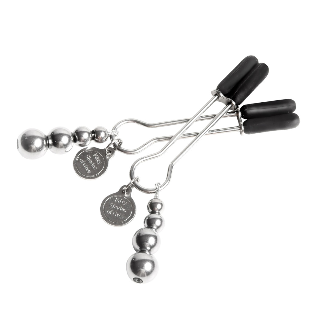 Exkluzív bimbószorító csipeszek A szürke ötven árnyalata kollekcióból!Élvezet és kényeztető fájdalom egyszerre.Exkluzív kivitelezésű mellbimbócsipeszek, strapabíró fémből, állítható szorítási erősséggel. Változó méretű gömbökből kialakított súlyokkal, melyek tömege egyenként 9gramm.A csipeszek teljes hossza, súllyal együtt, egyenként 8,5cm.1pár bimbócsipesz a csomagban. Anyaga: fém.Ajándék, ezüst színű szatén táskával.Használati útmutató letöltése (PDF)