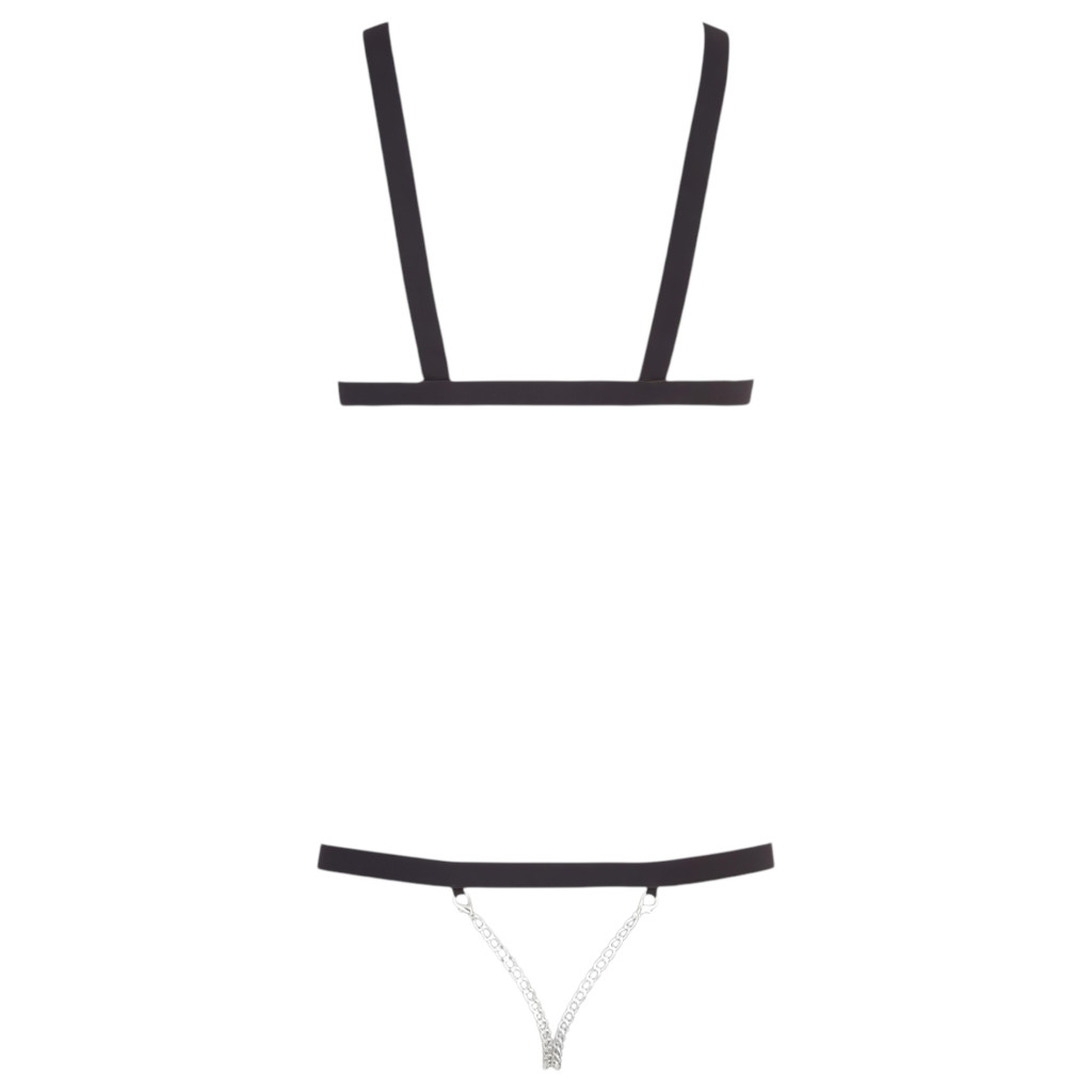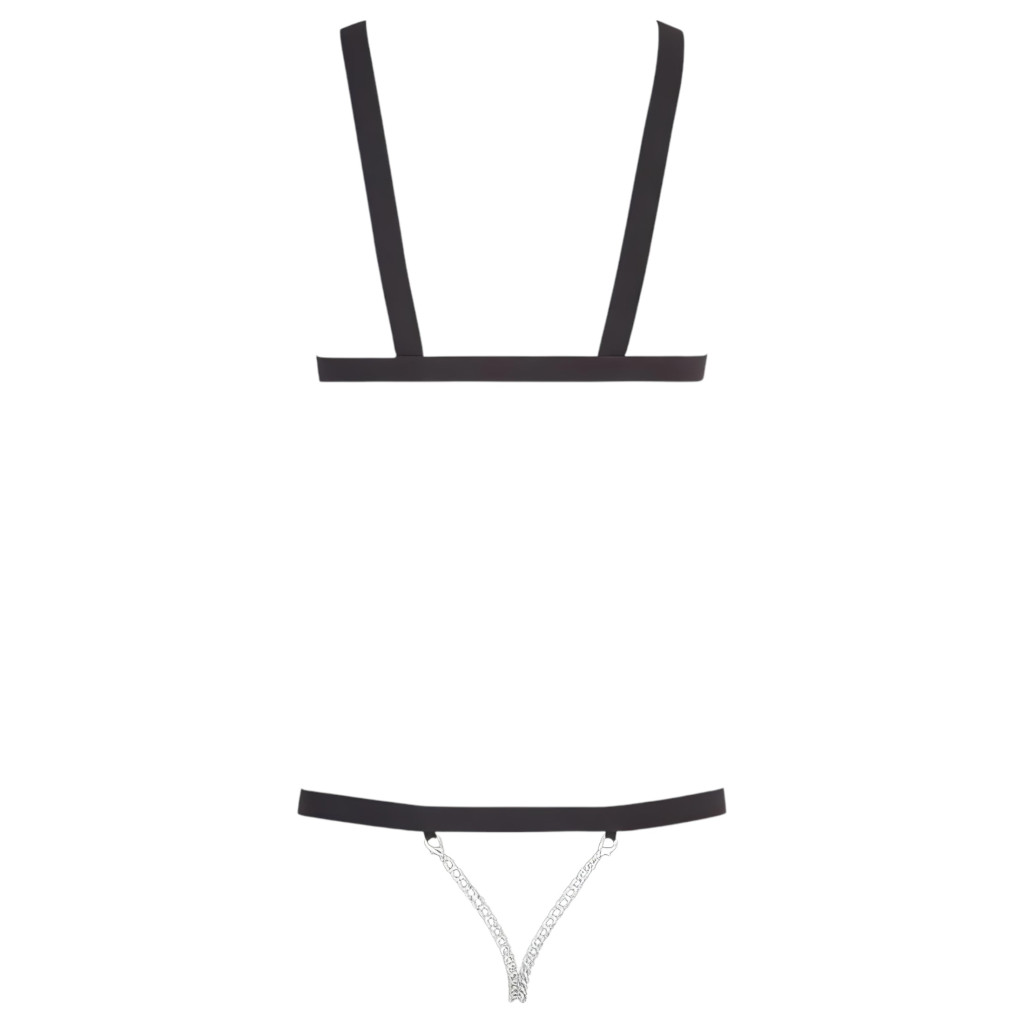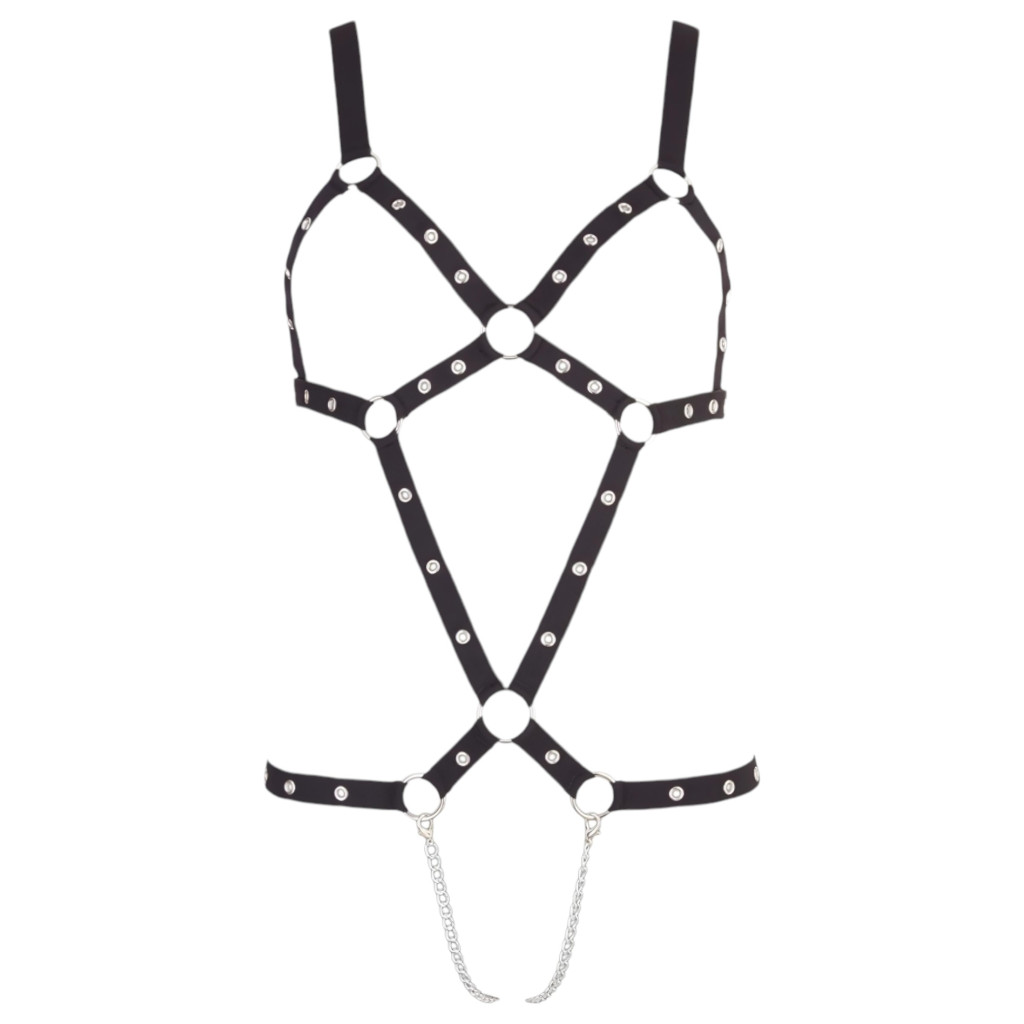 Tulajdonságok:-rugalmas, pántos kialakítás-fém gyűrűs díszek-szegecsekkel kirakva-karabineres fém láncok-fekete színben-ezüst színű fém részekkelAnyaga: 70% Polyester, 30% Elasthan.Mérete: egyenméret (S, M és L méretekre egyaránt passzol).