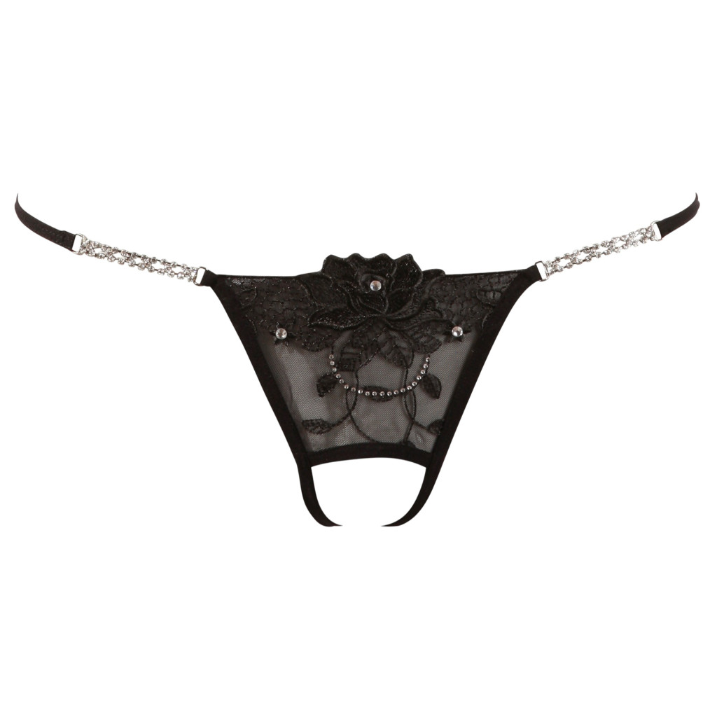 Szeméremnél nyitott tanga, csodálatos fekete, hímzett virág motívumokkal és csillogó strasszokkal gazdagon díszítve. Áttetsző fekete anyagból készült. A virágot apró kövek díszítik. Kétoldalt csillogó, hátul fűzős díszítéssel. Anyaga:100% Polyester.