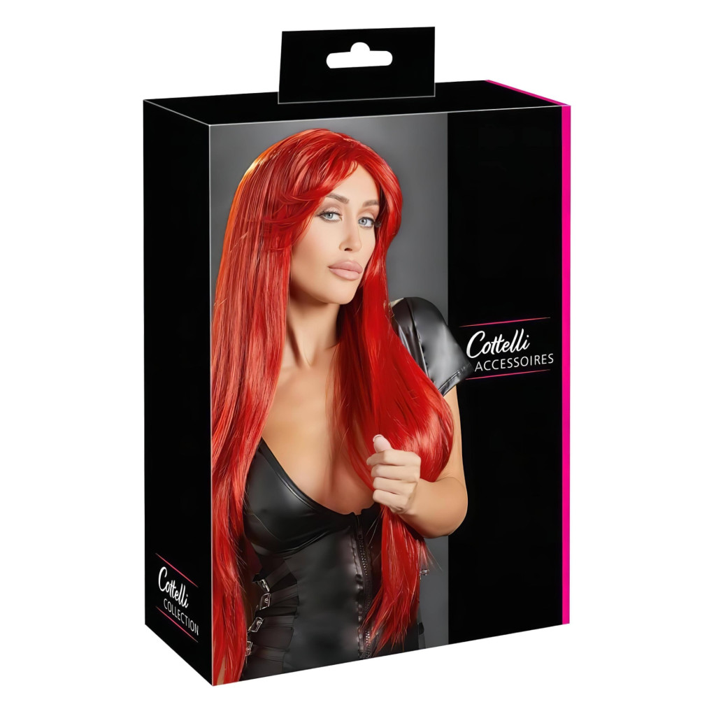 Extra hosszú, élénkvörös paróka, frufruval és lépcsős vágással.