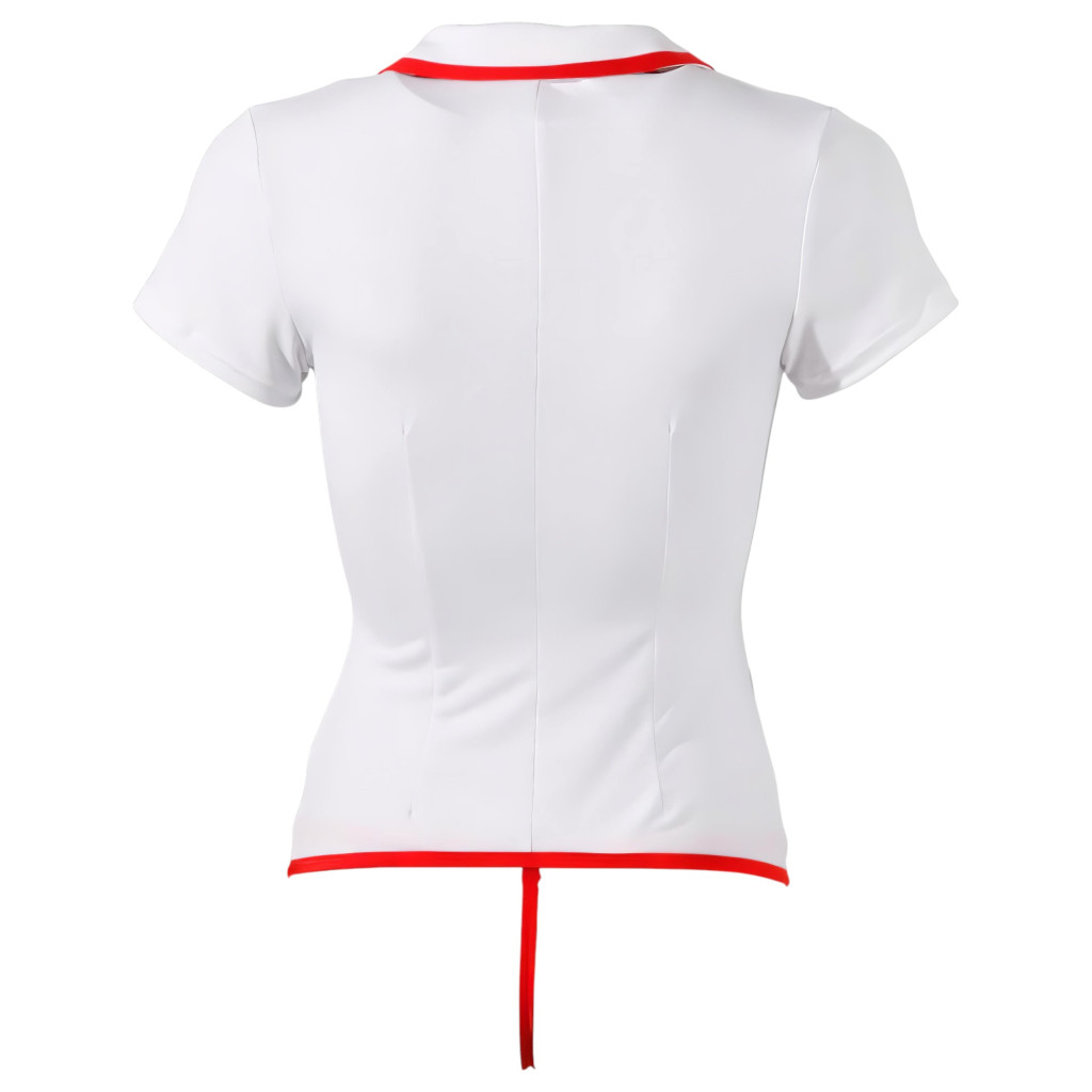 Rövid ujjú, galléros felső, elöl két zsebbel és lent két harisnyatartó pánttal. Extra mély dekoltázzsal, piros szegélyekkel és injekciós tű motívummal díszítve.