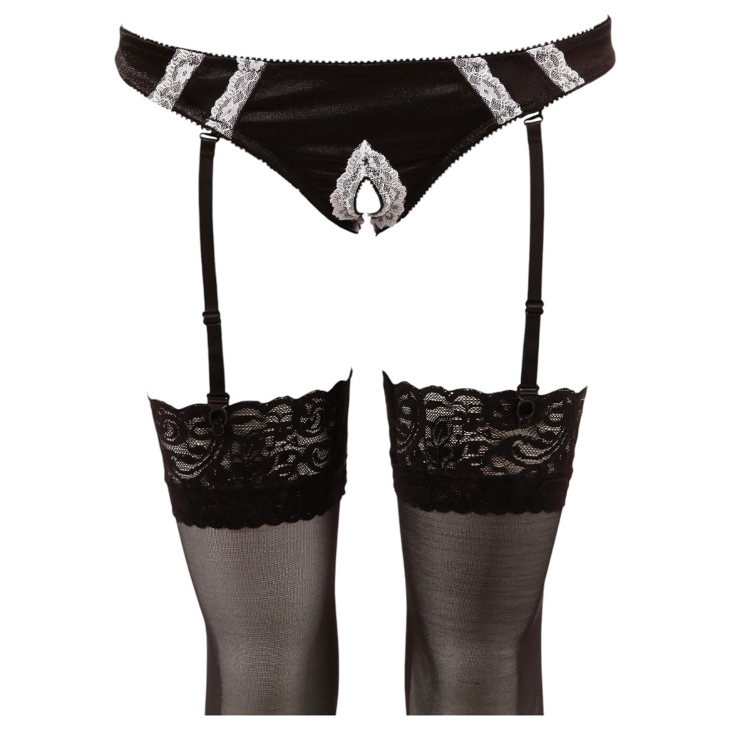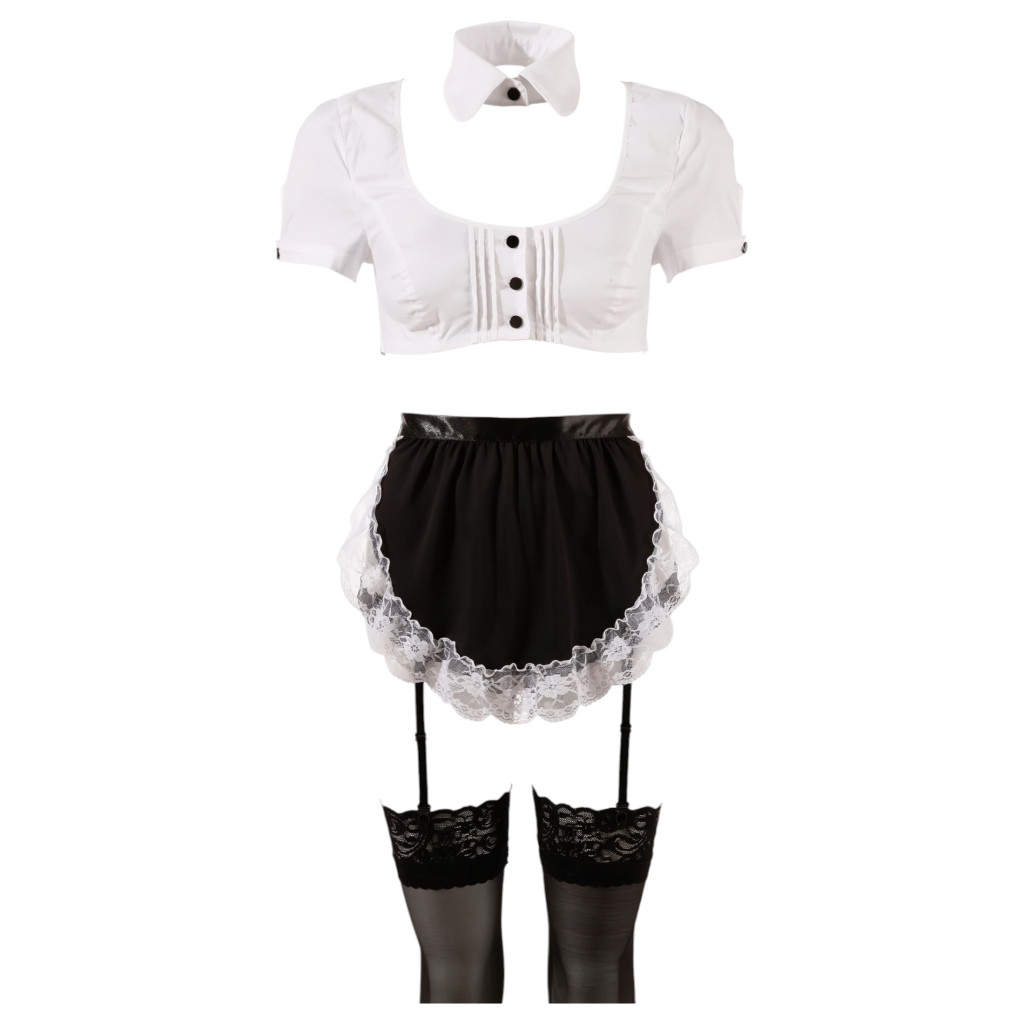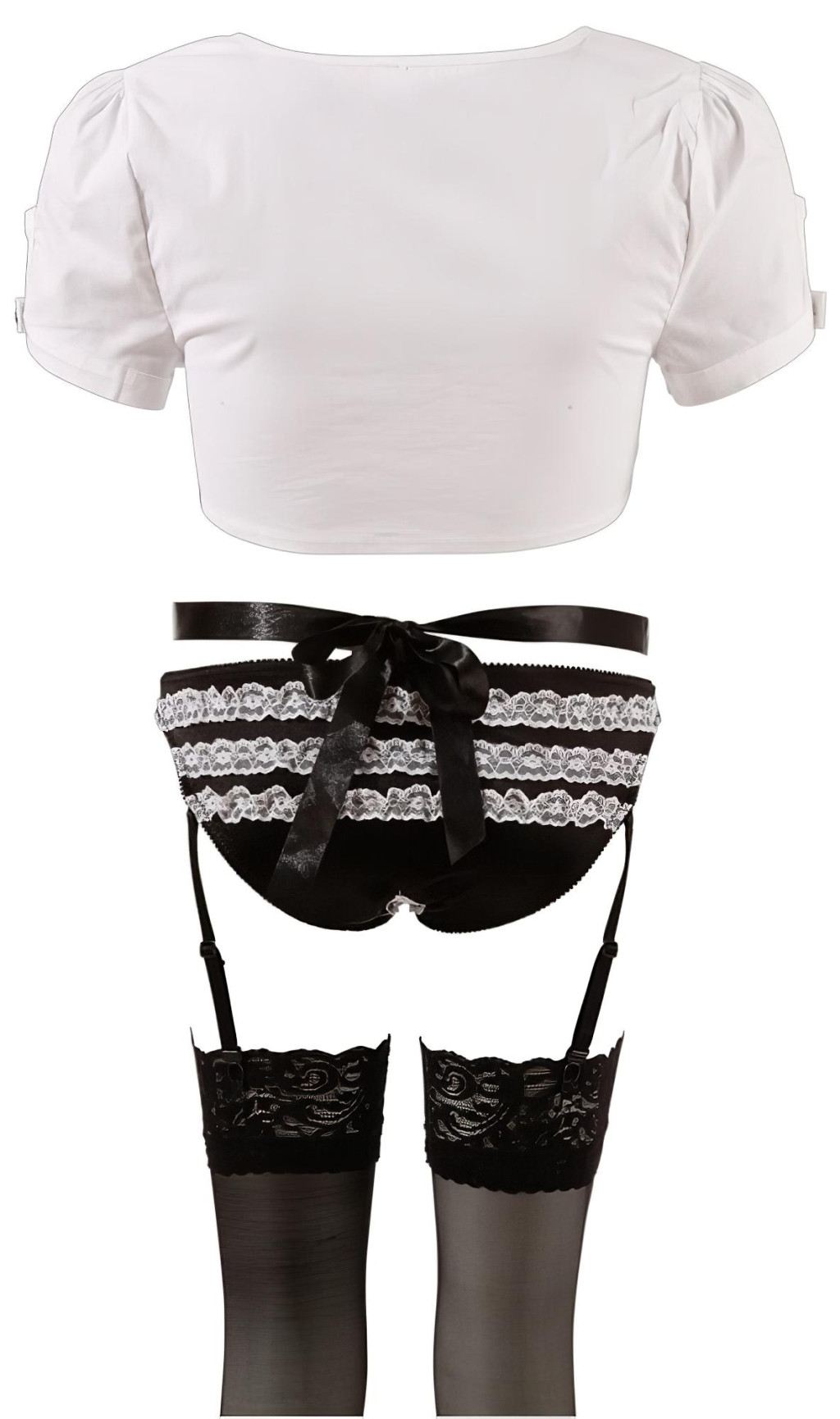 Hat részes szett. A mélyen dekoltált, rövidujjú fehér felső elöl fekete lakk gombokkal záródik. A harisnyatartós alsó fekete szaténból készül fodros, fehér csipkedíszítéssel. Szeméremnél végig nyitott, a nyílás mellett csipkeszegéllyel. A harisnyatartó pántok állíthatók és levehetők. A szett tartalmazza továbbá a fekete, csipkés harisnyát, a fehér, gombos gallért, a főkötőt hajpánttal, és a kötényt fehér csipkeszegéllyel, fekete szatén derékpánttal. A felső és a nyakpánt (80% pamut, 20% Elasthan), a harisnyatartós alsó (90% Polyamid, 10% Elasthan), a kötény és a főkötő (90% Polyester, 10% Elasthan). A harisnya (100% Polyamid). A toll cirógató nem része a szettnek.