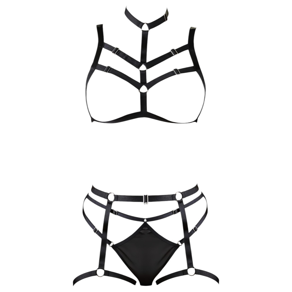 Cottelli - állítható pántos fehérnemű trió - fekete (S-L) 90% Polyester, 10% Elasthan.A szett tartalma:Gyűrűs, pántos melltartó:puha, ruganyos pántokbólteljesen nyitott kialakítássala keblek között három fém gyűrűvel összekapcsolvaállítható pántokkalösszekapcsolható nyakpántTanga:kétpántos megoldásállítható pántokkalelöl rombusz alakú szabáshátul az egész feneket láttató klasszikus tangaDerékhám:derékon és combokon viselendő kivitelhátul fém gyűrűbe érnek a pántokA szett anyaga: 90% Polyester, 10% Elasthan.Fekete színben.