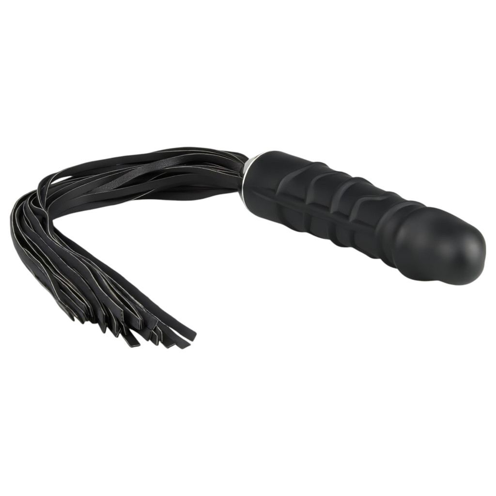 Kiváló minőségű, műbőr szálakból készülő korbács. Strapabíró, erős nyéllel, mely kellemes szilikon borítást és pénisz formát kapott. Stimuláló, bordás felszínnel, formás makkal ellátva.Magas minőségben, kiváló anyagok felhasználásával.Főbb tulajdonságok:-teljes hossz (nyéllel együtt): 46cm-dildó behelyezhető hossza: 14cm-dildó max. átmérője: 3,6cm (normál méret)A termék nem tartalmaz elektromos részeket, így vízálló, egyszerűen tisztíthat.Anyaga: műbőr, Szilikon (EU-rendeletnek megfelelő, phthalát-mentes).Fekete színben.