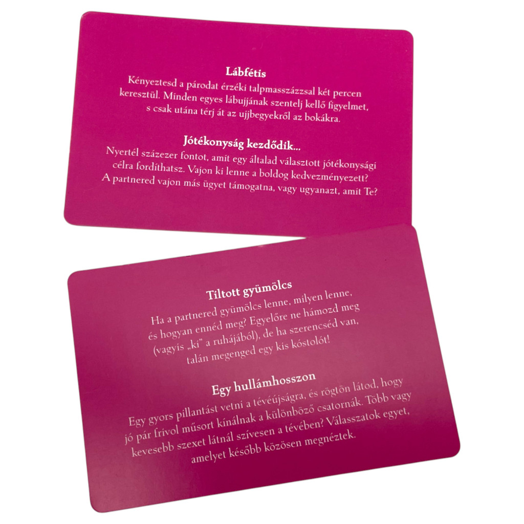 A játék során több, mint 390 szórakoztató feladat vár rátok, három különböző szinten (Intim, Szenvedély, Forró). Ahogy a játék halad előre vidám párbeszédekben és izgalmas feladatokban lesz részetek, mialatt egyre többet tudtok meg egymás testéről, elméjéről, egyre közelebb érve ahhoz a felismeréshez, hogy mi az, ami a párotokat igazán lázba hozza! A szinteken előrehaladva ahogy a hangulatotok egyre fokozódik, úgy válnak a feladatok is egyre intimebbekké, szenvedélyesebbekké, forróbbakká!