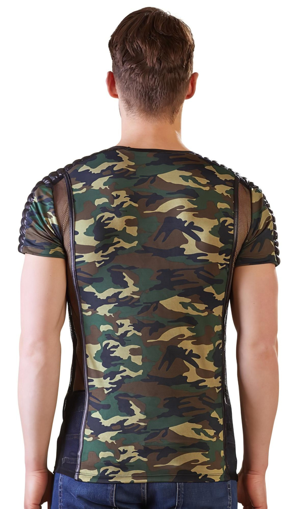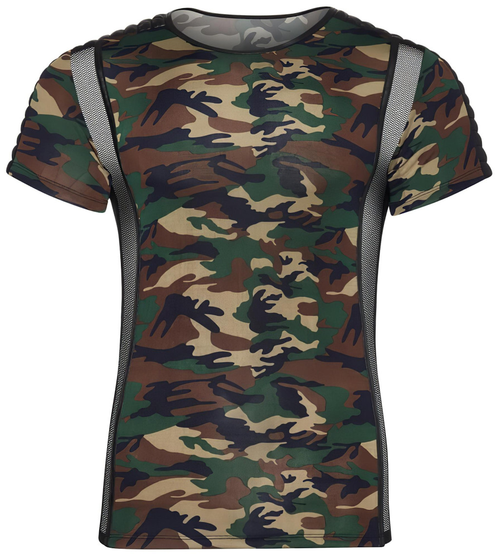 Férfi póló mikroszálas anyagból.Kétoldalt áttetsző, fekete necc betétekkel, a vállakon és végig az ujjakon, fényes domború, fekete anyaggal.Rövid ujjakkal, kerek nyakkal.Anyaga: 95% Polyester, 5% Elasthan.A necc anyaga: 90% Polyester, 10% Elasthan.Terepmintás színben.