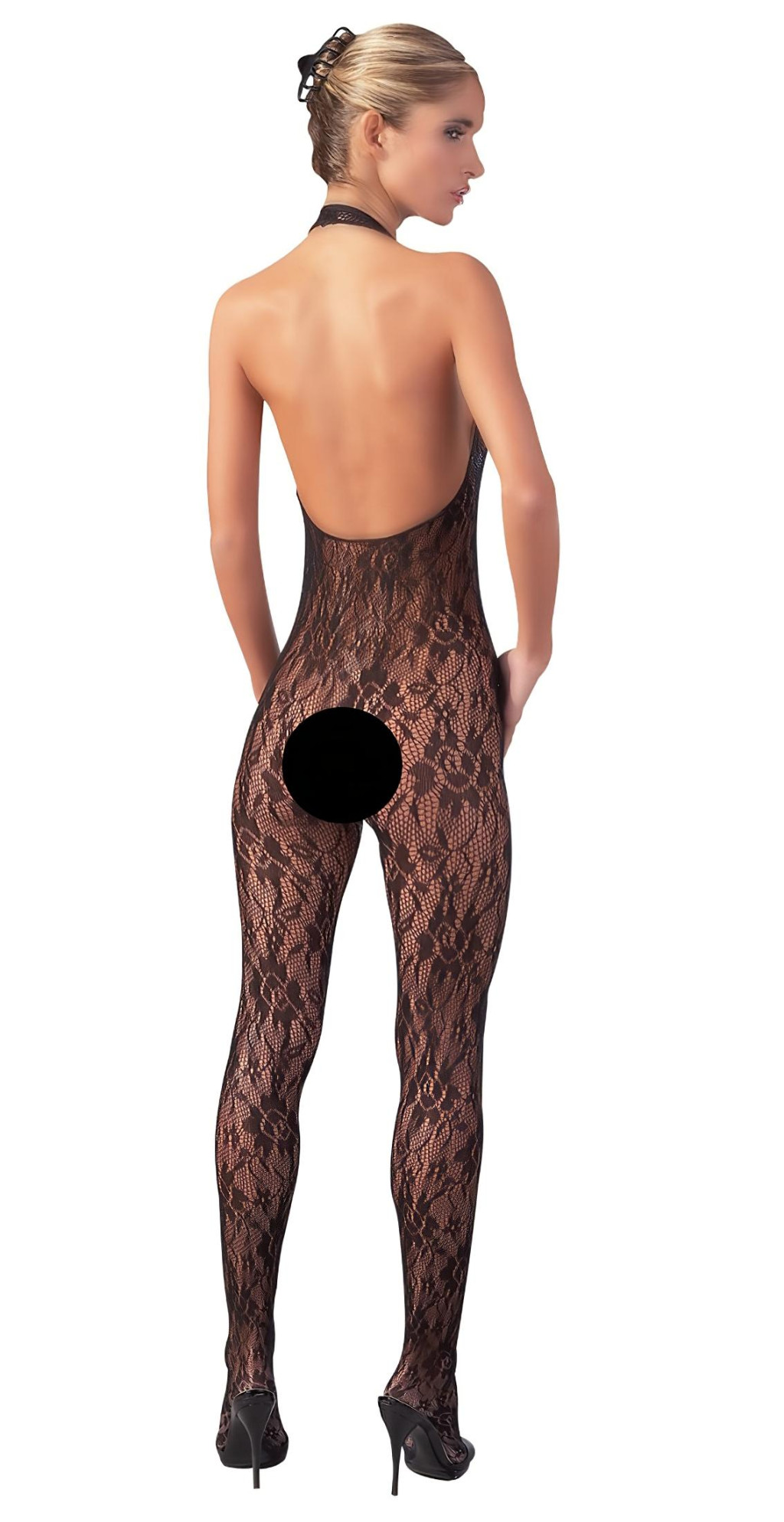 Puha csipke tetőtől talpig. Látványos szövésű, rugalmas csipkéből készült, szeméremnél nyitott overall, mély, gyöngyökkel díszített dekoltázzsal. Nyakpántos kialakítású, mély hátkivágással. Fekete színben. Mérete: S/M. Anyaga: 100% Polyamid.