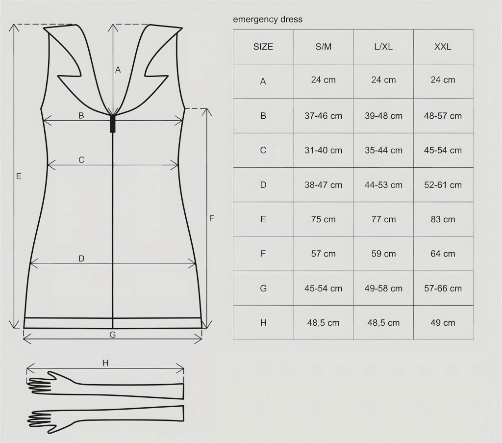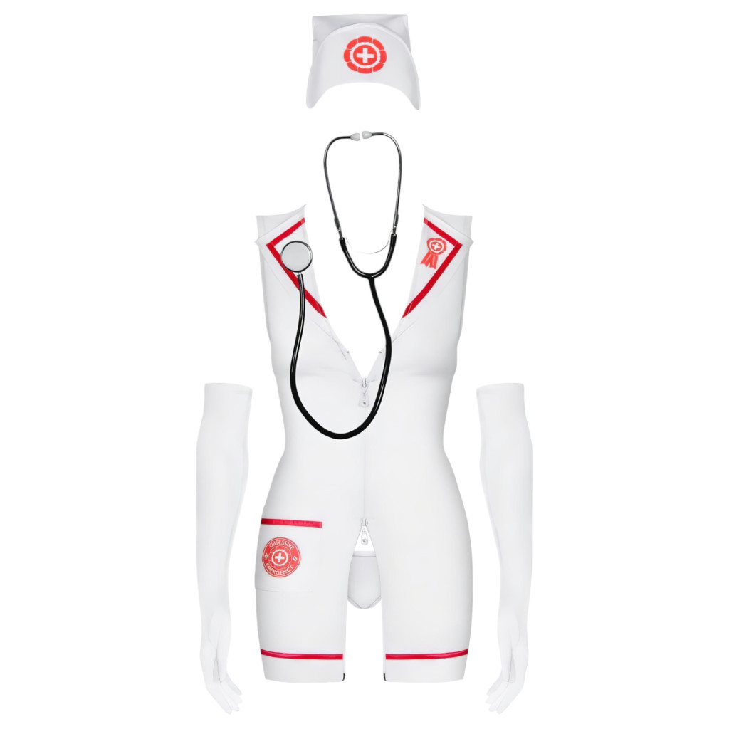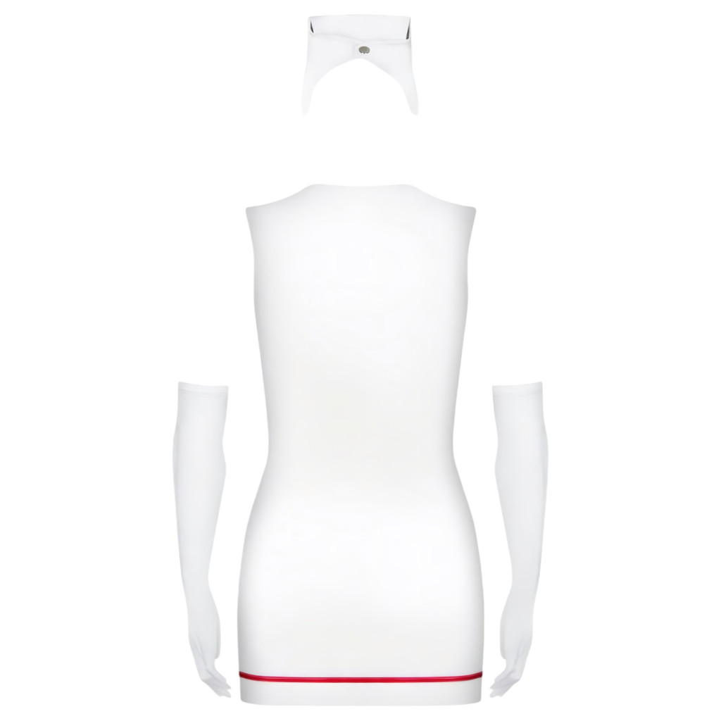 Ruganyos, kényelmes, jó minőségű anyagból készülő ujjatlan miniruha, galléros kialakítással, piros díszítésekkel, keresztekkel, mély dekoltázzsal.Elöl középen kétutas cipzárral.A szett tartalma:-nővérke miniruha-1 pár fehér, hosszú, ruganyos kesztyű-főkötő-tanga, rugalmas pántokkal-sztetoszkópFehér színben.Mérete: S/M (egyenméret: S és M méretre egyaránt passzol).
