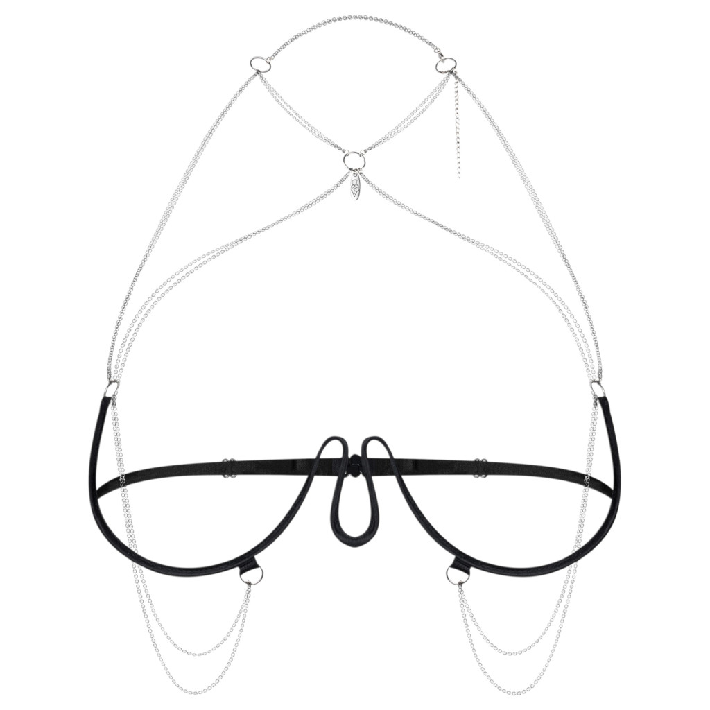 1 db Obsessive Premium láncos hám melltartó (fekete). (A harisnya és a mellbimbótakaró nem része a csomagnak.)