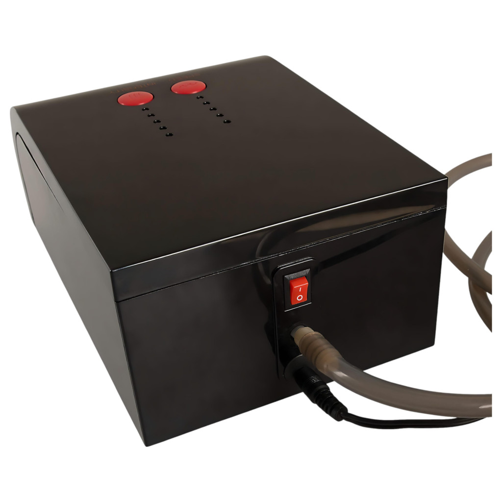 "Ami az elérhető, átélhető érzést illeti, nehéz szavakba önteni a tapasztalataimat; a „Suck-O-Mat" által biztosított inger semmilyen más általam próbált segédeszközhöz nem hasonlít, rendkívül finom, egyáltalán nem direkt, leginkább valóban egy nagyon gyengéd, lehelet finom, igencsak bőnyálas, érzékien kivitelezett franciához mérhető. " Krisztián - Life.huA készülék nagyobb átmérő esetén működik jól igazán, így abban az esetben használd, ha hímtagod átmérője eléri a min. 3,7cm-t.Működés:A nagy teljesítményű szivattyú által keltett szívó impulzusok biztosítják a péniszen a rugalmas, puha mandzsetta automatikus, ritmusos rászorító-elengedő (fel-le) mozgását, amelyet az integrált gyűrű tart a helyén.A szívó stimuláció erőssége 5 intenzitási szinten állítható, minden stimuláció egyénileg 5 sebességi fokozatban vezérelhető, így összesen 25 különböző változatot tapasztalhatsz meg.A percenkénti szívóimpulzusok száma az 1. szinten 42, míg a legfelső, 5. szinten akár 109 is lehet.A szívó teljesítmény fokozatosan növekszik (16W-30W).Tulajdonságok:-praktikus kéz nélkül is használható-hálózati működés-erős, műanyag vezérlőegység-speciális szívóimpulzus technológia, rászorító-elengedő (fel-le) mozgással-rugalmas mandzsetta-5 szinten állítható szívó-erősség-5 gyorsasági sebesség szintenként-erős, elektromos motor-egyszerű, két gombos vezérlés-a mandzsetta hossza: 15cm-mandzsetta belső bemeneti átmérője: 2,5cm (rugalmas)-mandzsetta belső átmérője: kb. 3,7-4cm-mandzsetta külső átmérője: 6,5cm-motorház hossza: 20cm-motorház szélessége: 13cm-motorház magassága: 8cm-kábel hossza: 2m-tömlő hossza: 1,5m-a tömlő és a mandzsetta mosható-fekete-szürke színAnyag: ABS (készülék és gombok), Szilikon (tömlő), TPE (mandzsetta), PP (szűrő) (EU-rendeletnek megfelelő, phtahlát-mentes).A csomag tartalmazza a 100-240V (EU-szabvány) hálózati adaptert (kimenet: 12V / 3A).TIPP:A termék síkosításához kizárólag vízbázisú síkosító használata javasolt, egyéb más készítmények károsíthatják az anyagát.