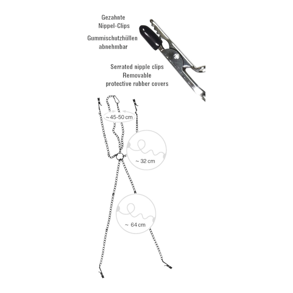 A mellek közötti gyűrű (átmérője 3,5cm) a nyakláncot, a két mell-láncot kapcsokkal (mindkettő kb. 30cm hosszú) és a két szeméremajak-láncot (mindkettő 66cm) kapcsolja össze. A nyaklánc mérete karabínerrel állítható.