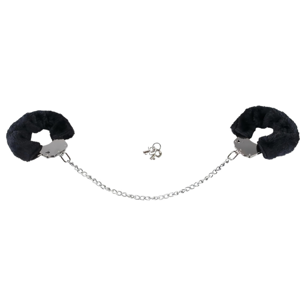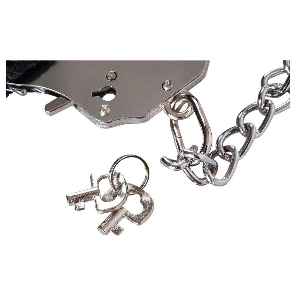 Erős fém bilincs, levehető, puha plüss borítással. Kézi kioldóval és két kulccsal. Extra hosszú, 44cm-es lánccal készül.