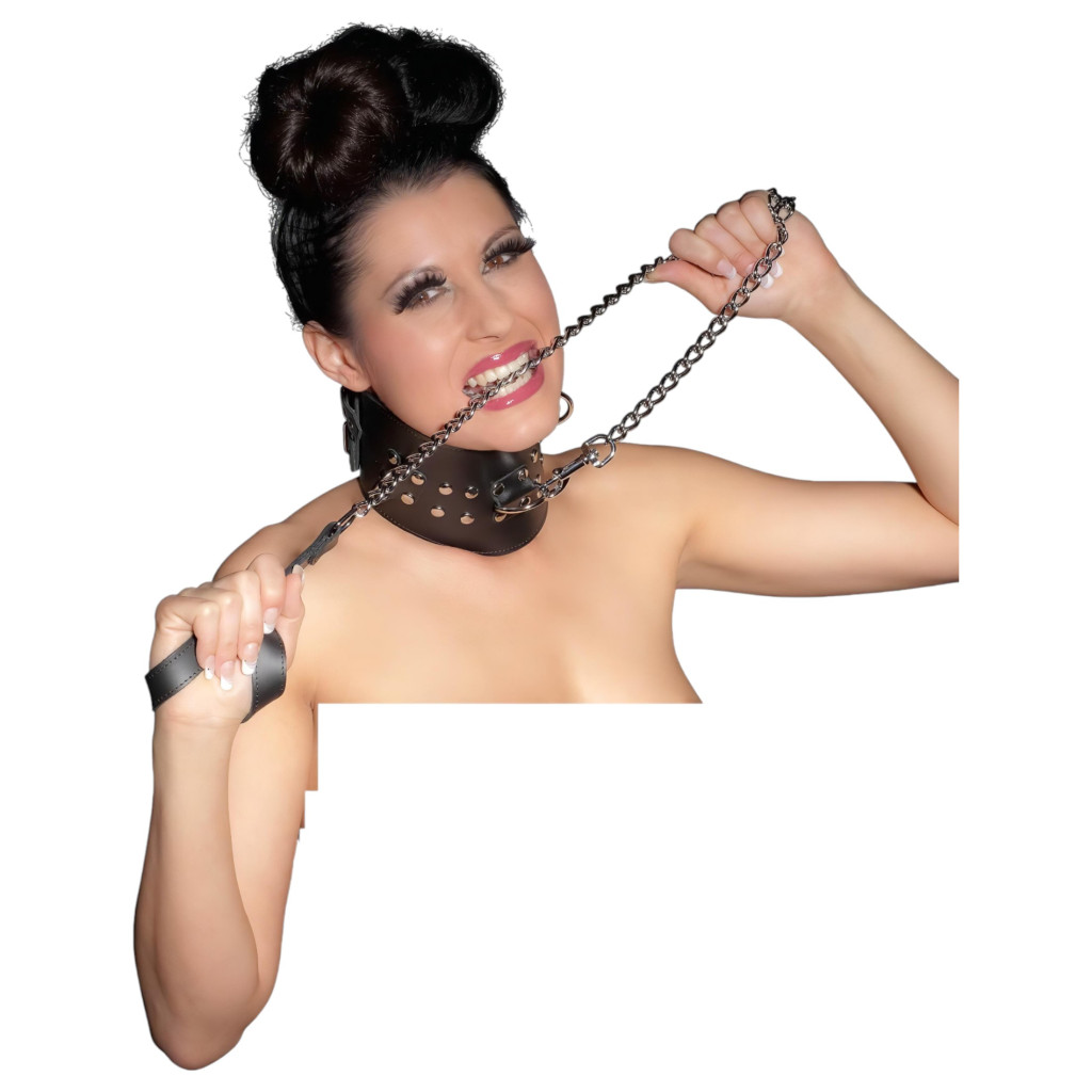Ezüst színű, nikkelmentes fémből készült póráz, az egyik végén karabinerrel, a másikon fekete bőrből készült fogantyúval (kb. 20cm-es). A póráz teljes hossza 110cm. Nyakpánt nélkül szállítjuk.