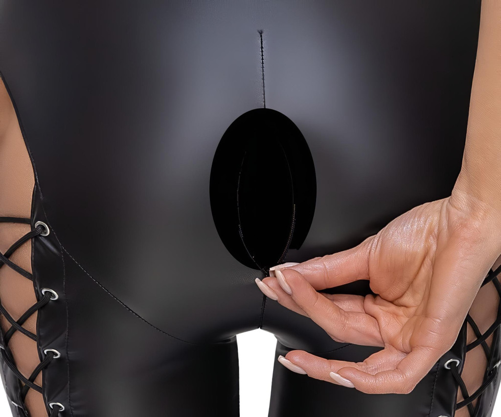Szeméremnél 2 irányú cipzárral - melynek köszönhetően egyszerűne szabaddá tehető a szemérem és a popsi egy gyors, spontán aktushoz